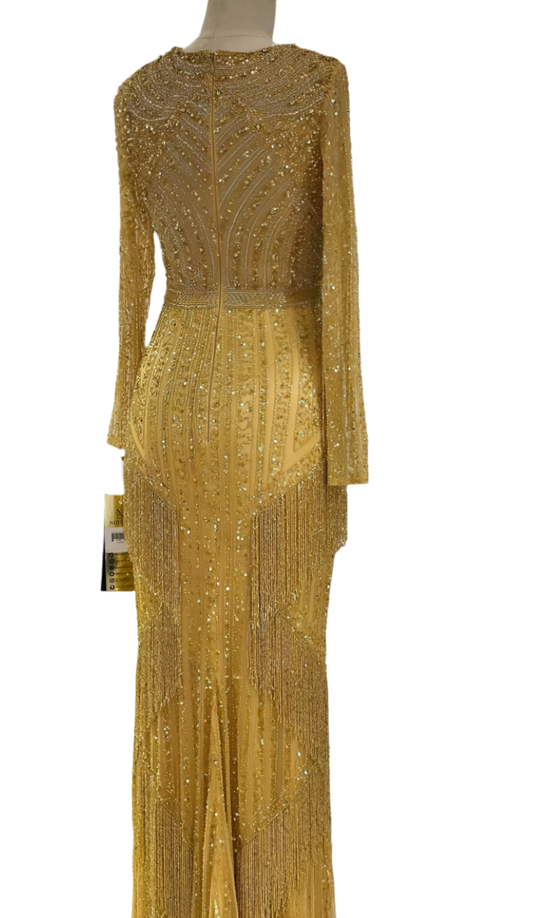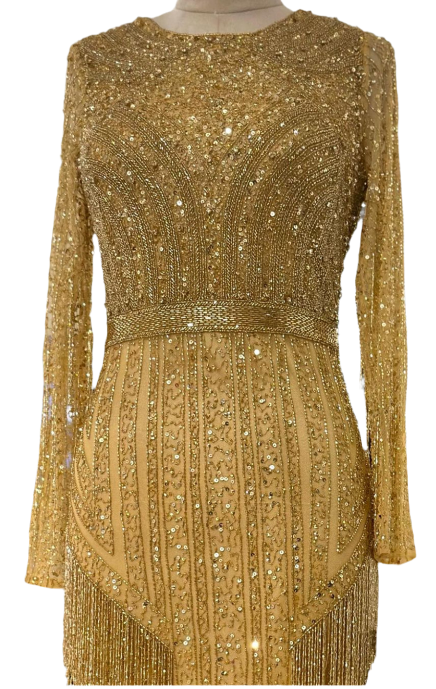 Luxury Dress: Catch everyone's eye on stage in this stunning gown. The fringe with sway in the lights, as the bottom of the gown is covered in beaded fringe, as well as the back off of the shoulders. This gown is fully beaded and is encrusted with crystals golden. The embroidery consists of beads and sequins is used for high level special occasions.